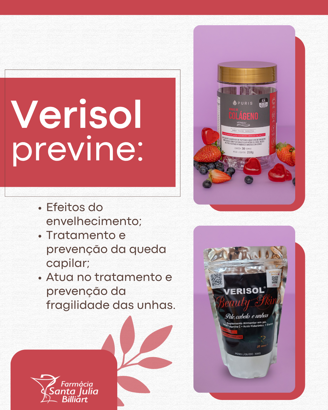 Você já conhece o Verisol? Ele é o único colágeno desenvolvido especialmente para a saúde da pele, agindo de dentro para fora para reduzir rugas e aumentar a elasticidade.
