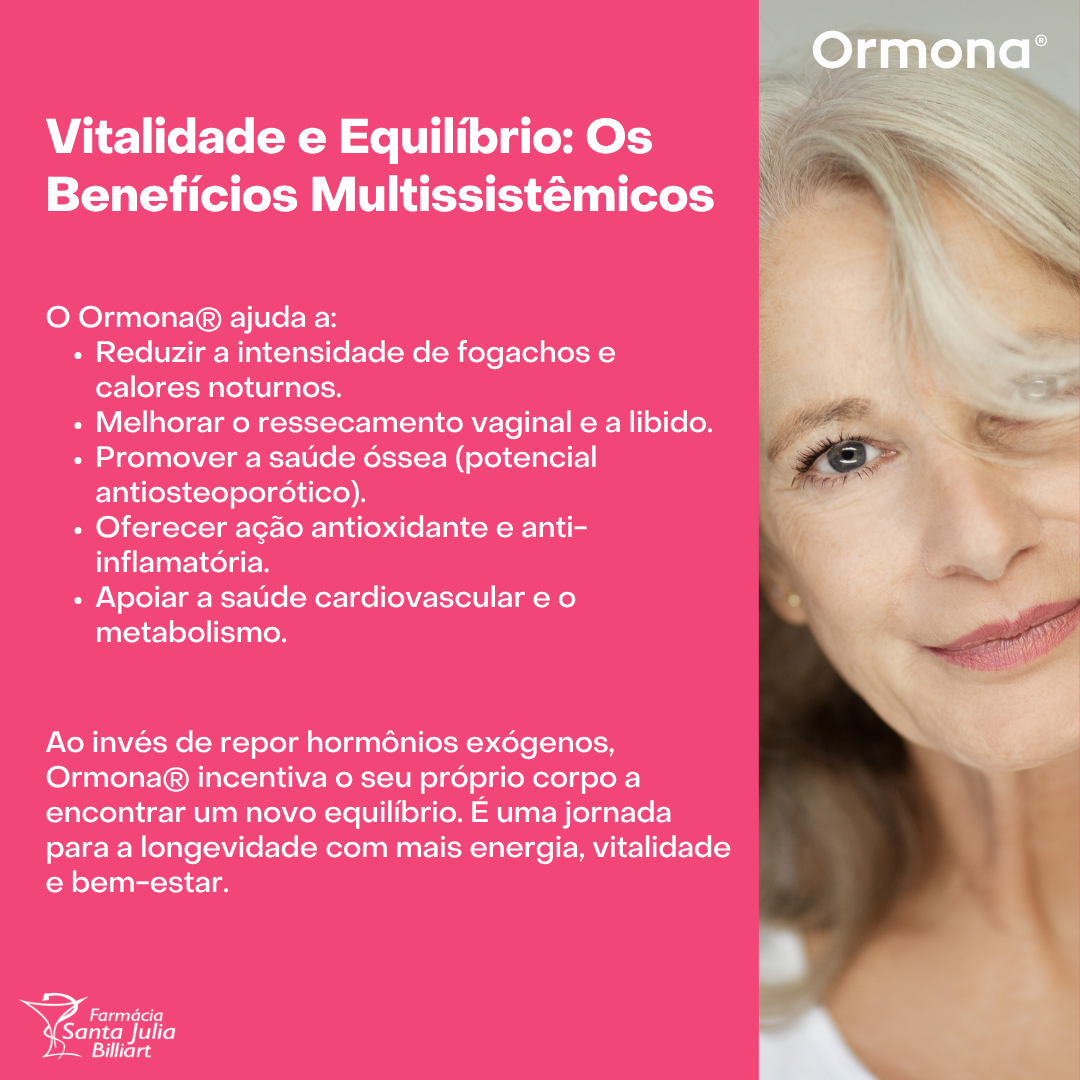 Se você busca uma jornada mais suave durante o climatério e a menopausa, o Ormona® é o seu aliado natural. Um complexo bioativo que te ajuda a reencontrar o bem-estar e a vitalidade.