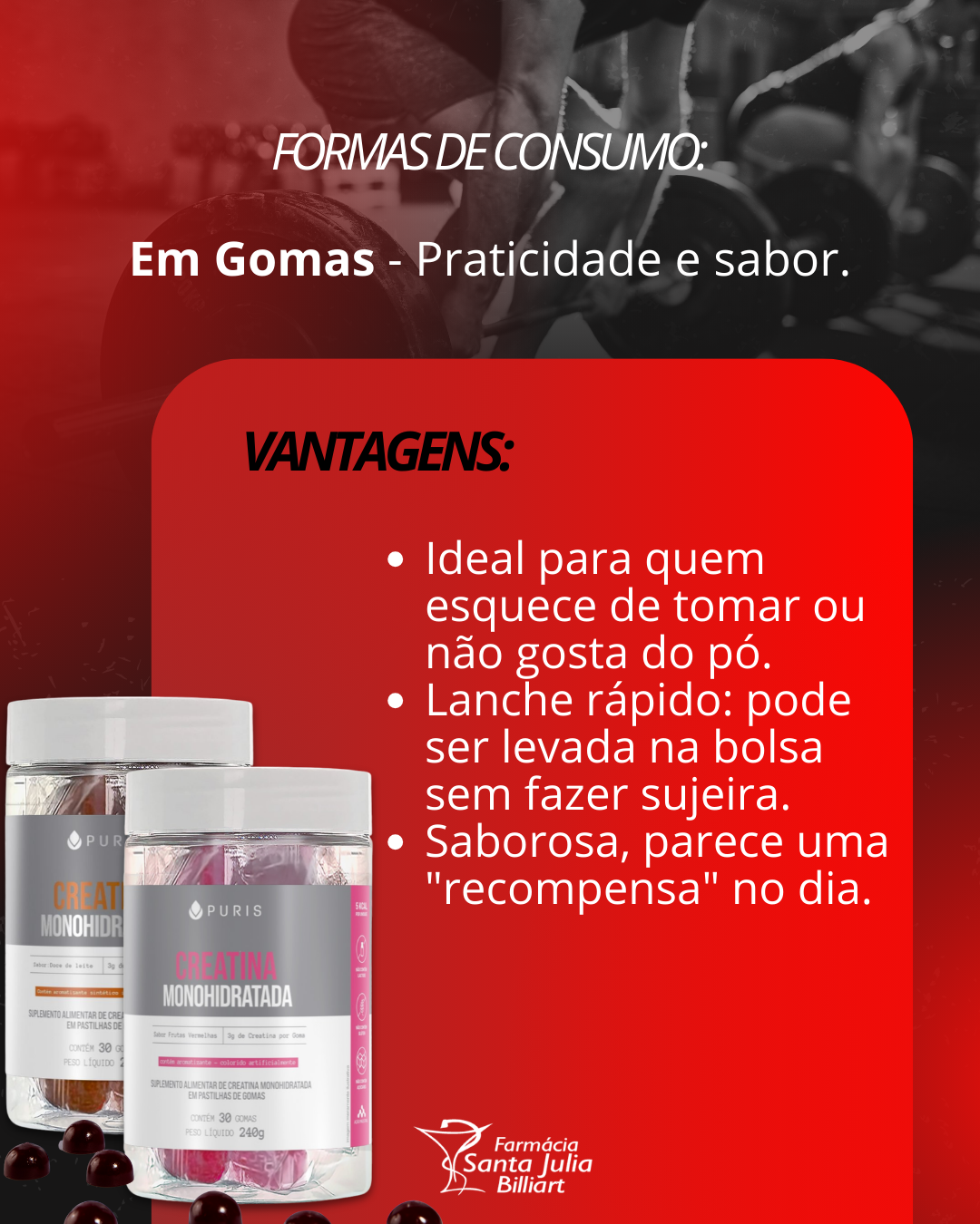 Gomas: A união perfeita entre sabor e praticidade. Ideal para quem esquece de tomar o suplemento ou quer evitar o preparo com água. É só mastigar e pronto!